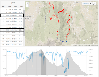 No final da subida somos "presenteados" com uma área mais plana, onde ainda tentei voltar a correr, mas já estava a ser complicado. Corria uns 400 metros e tinha de voltar novamente a caminhar. Aqui e tal como no dia anterior seguia sozinho, não via nem ouvia ninguém à minha volta até que quando começo a descida para o ultimo abastecimento começam a passar os primeiros atletas dos 53 Km por mim. Portanto enquanto eu fiz cerca de 15 Km eles fizeram cerca de 45.